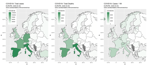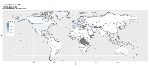 A világ országainak fertőzési és elhalálozási adatai, valamint az 1M lakosra jutó fertőzésszám itt látható (adatok: https://www.worldometers.info/coronavirus, alap-parancssor: https://www.r-spatial.org/r/2018/10/25/ggplot2-sf.html). Az 1M lakosra jutó aktuális fertőzésszám: