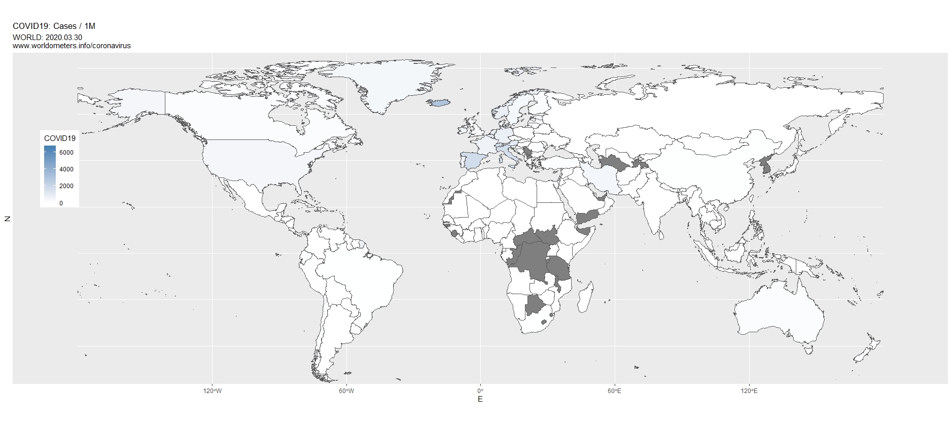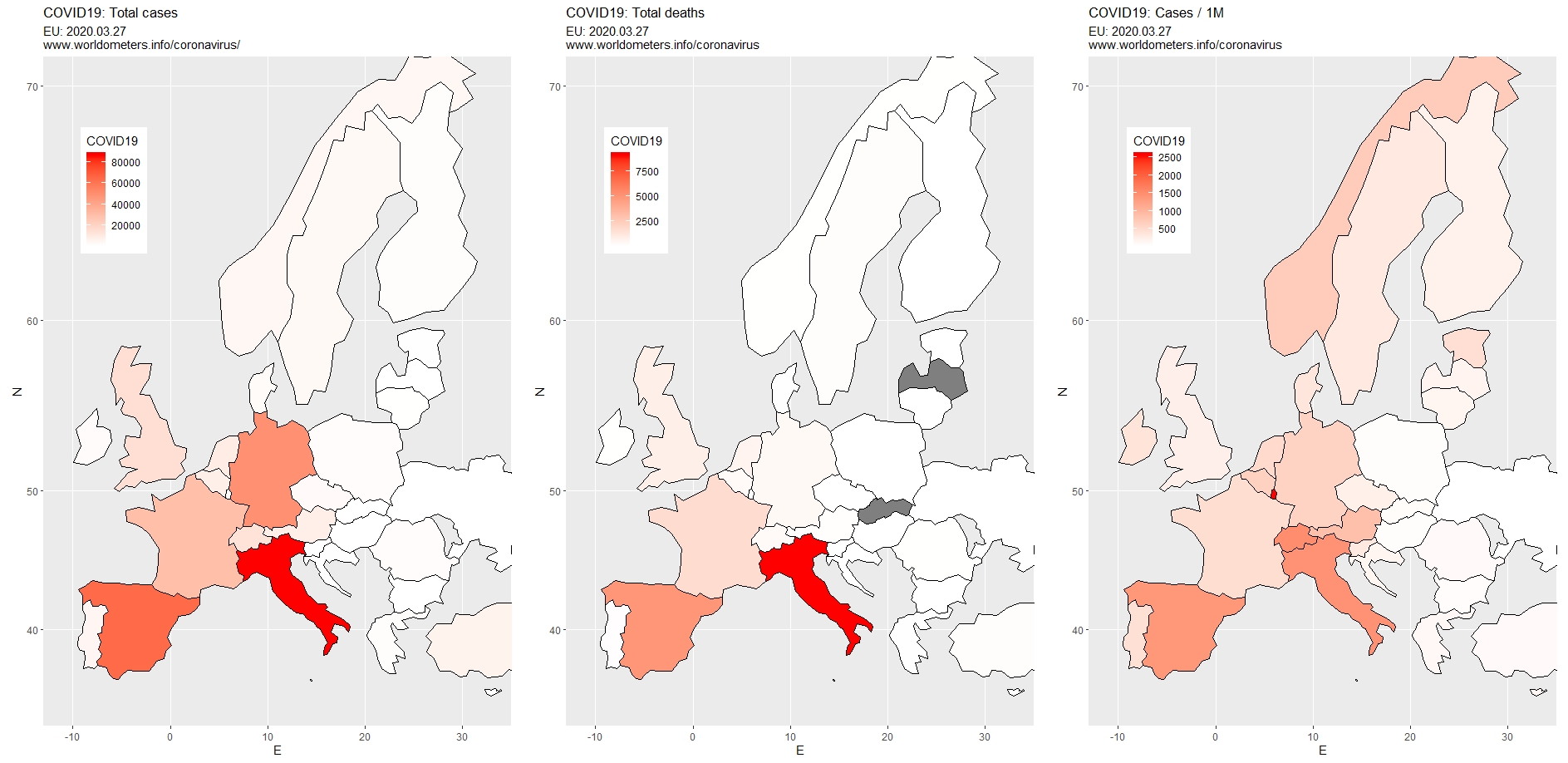 Az európai fertőzések, halálesetek és 1M-ra jutó fertőzések számának alakulása a következő táblázat alapján: https://www.worldometers.info/coronavirus/. Az alap parancssor innen származik: https://egallic.fr/en/european-map-using-r/. Az Európai hőtérkép mutat március 30-án 12:15-kor (az előző):